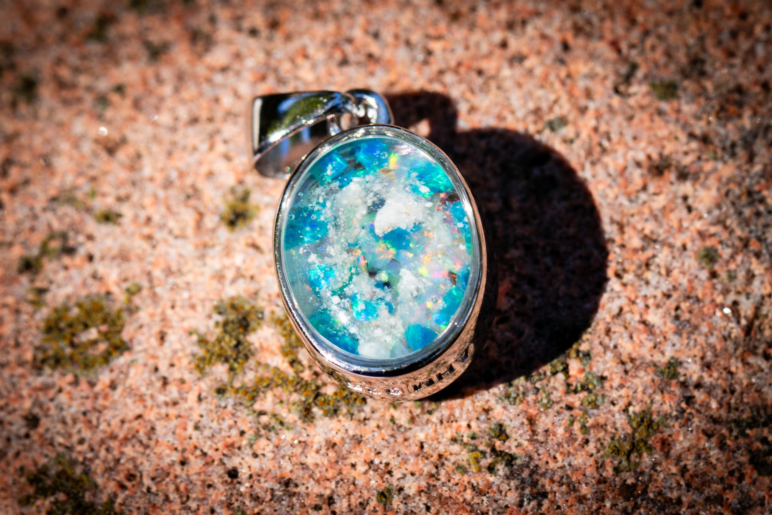 For information on ordering and discounts, add to cart and look over our How To Order page. Free shipping covers sending you the kit and Spirit Piece. You're still responsible for paying to send the cremains back. Eligible for up to 20% off for larger family purchases. Due to the reflective nature of opal, you will see a spectrum of colors outside of the selected colors for your piece. The colors displayed will vary based on colors combination, setting, and ash consistency. |