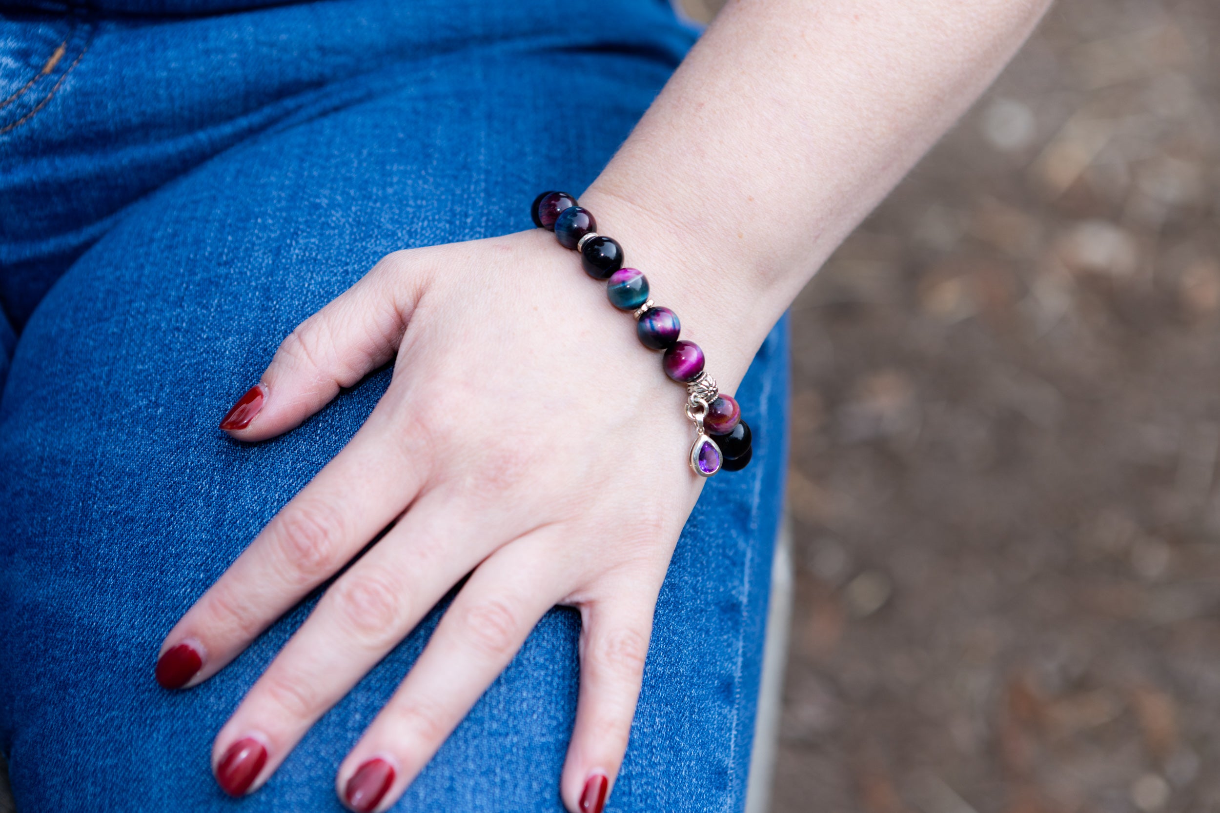 Rainbow Tiger Eye Cremation Bracelet with Amethyst Dewdrop