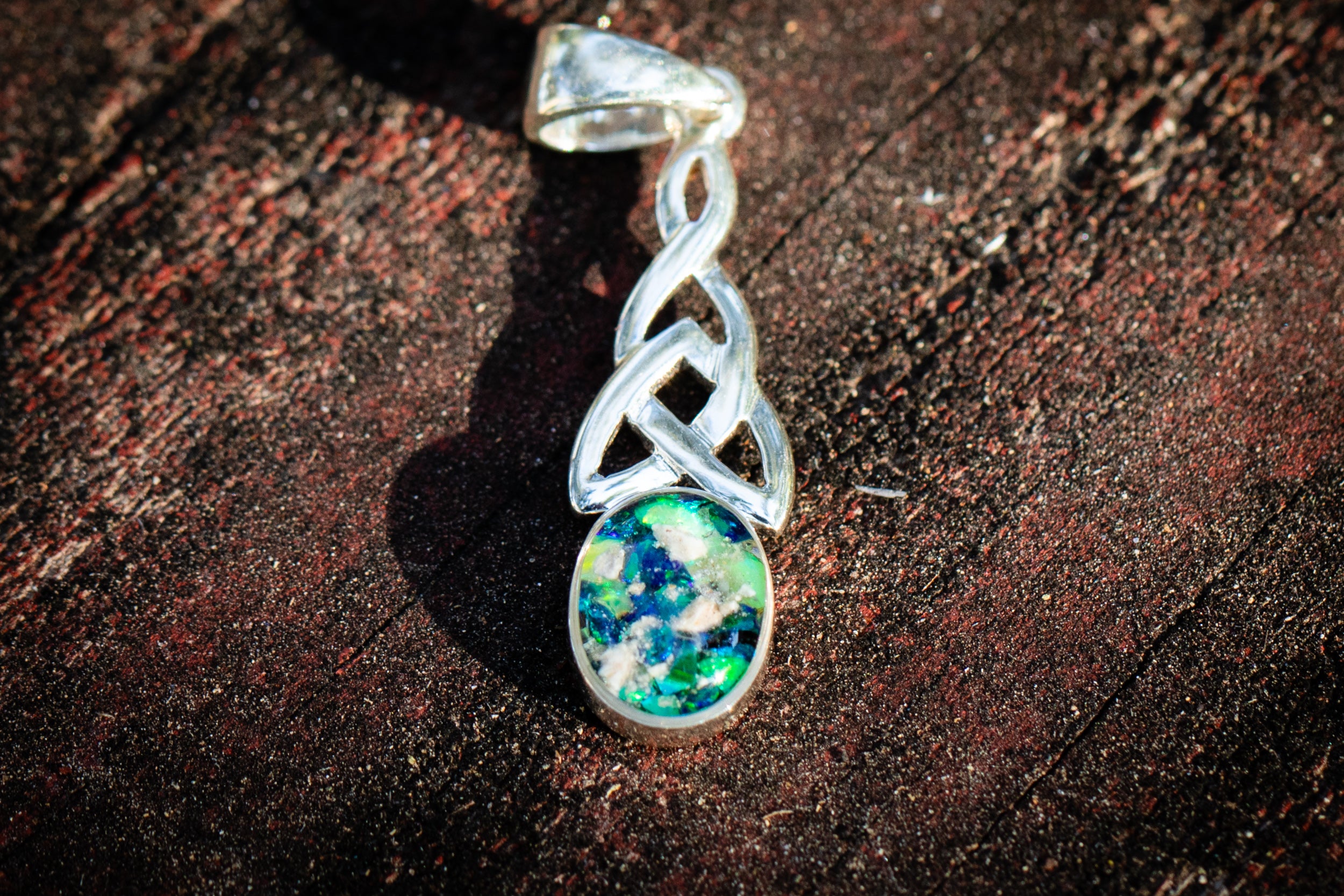 The Triquetra Celtic Drop Pendant with ashes sparkles beautifully and vibrantly. Filled with crushed synthetic opal and cremation ash from your dearly departed, it is a gorgeous way to honor the memory of your loved one. Shown in Teal & Lime for both sizes