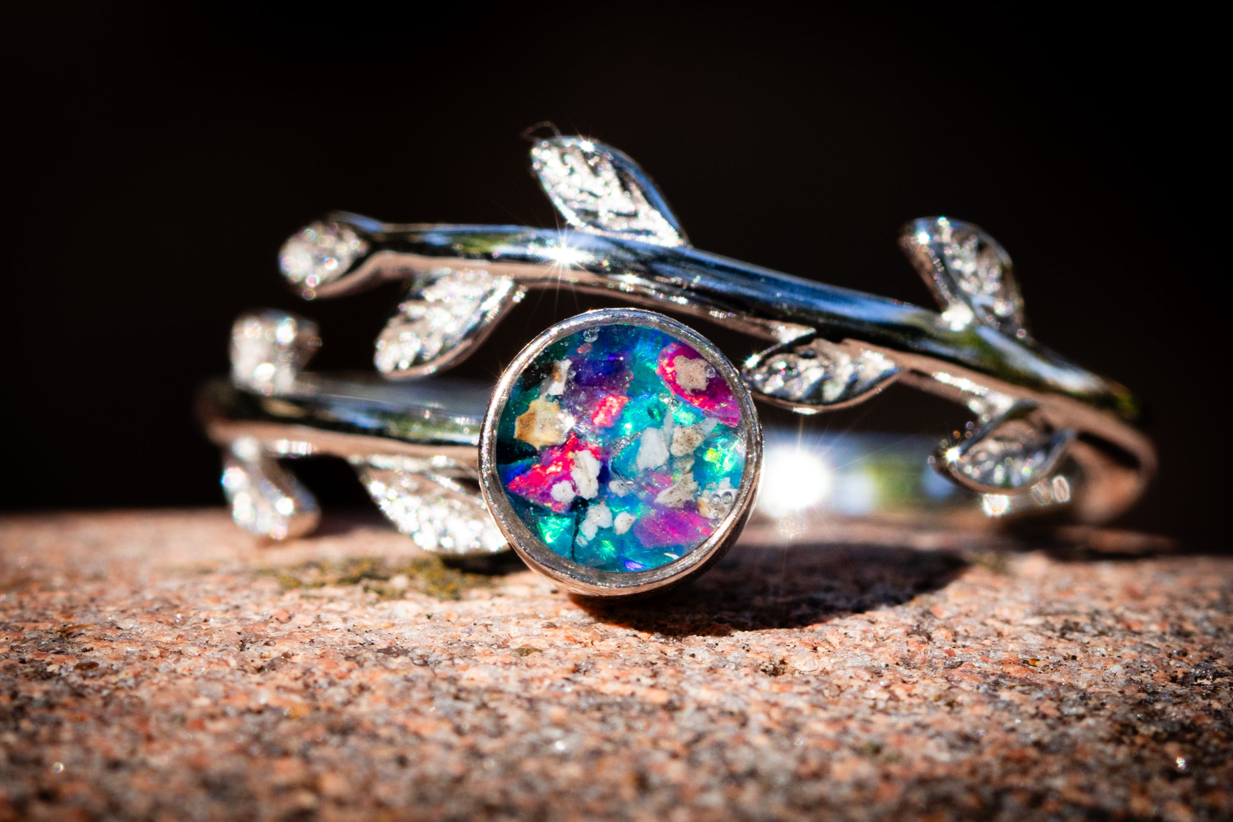 This leaf spin ring is more than just a beautiful piece of jewelry - it is a precious symbol of the eternal bond between you and your loved one. With its exquisite design and the inclusion of colorful crushed opal and cremation ashes, this ring is a celebration of life, love, and memory. The bezel is what spins. Shown in Dark Blue & Turquoise