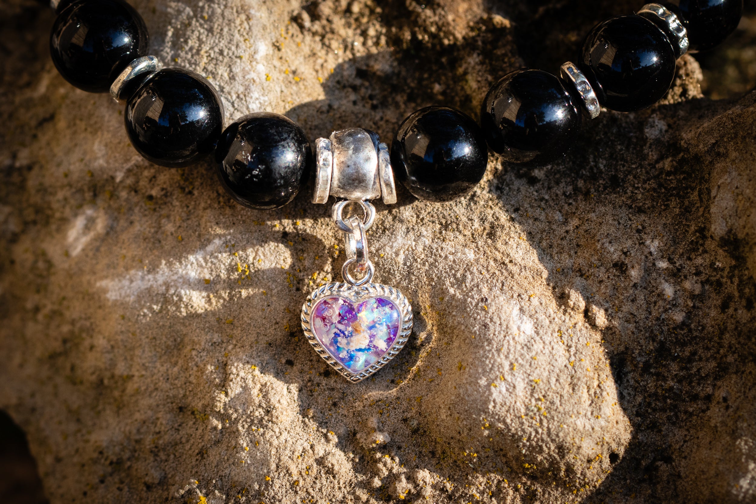 This elegant Onyx beaded bracelet has a sterling silver charm filled with crushed synthetic opal and infused with cremation ash of your loved one, making it a beautifully discrete way to keep your loved one close to your heart. Shown in Blue, Purple, and White