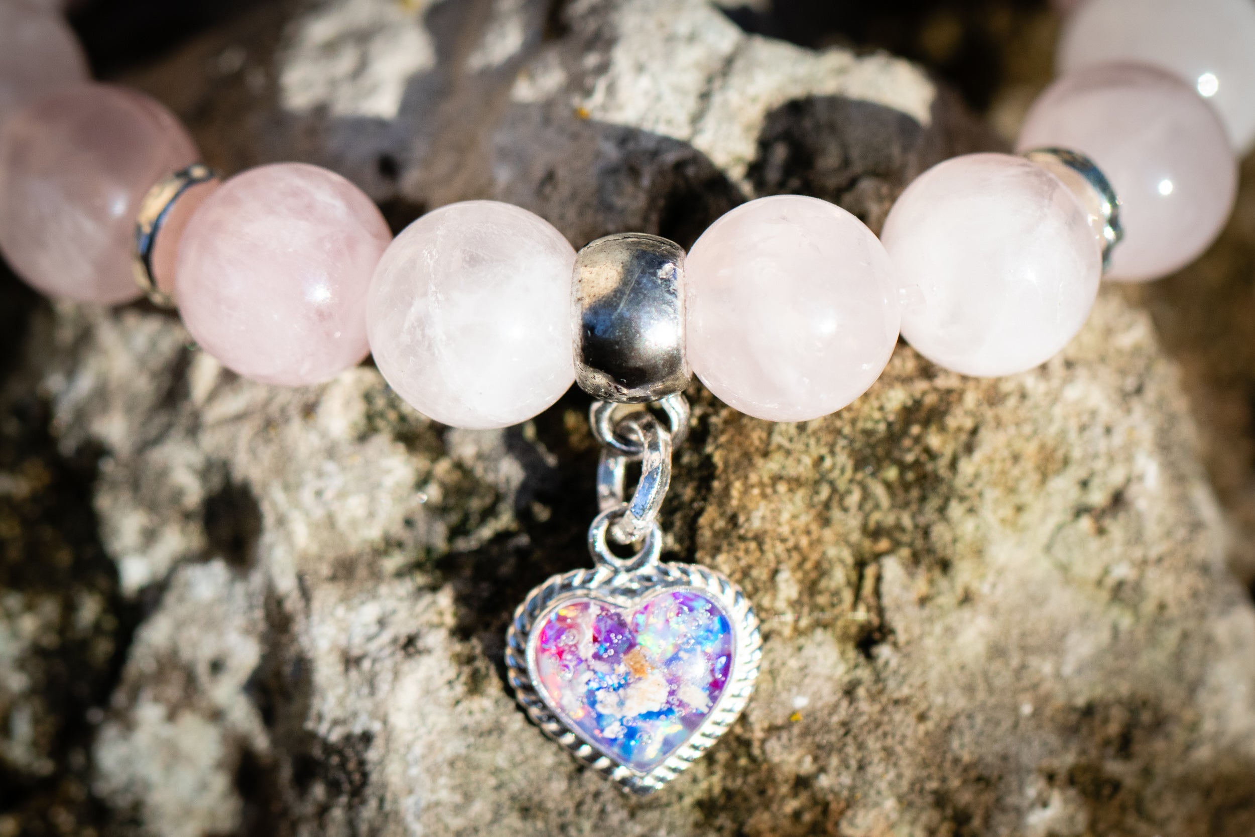 This elegant Rose Quartz beaded bracelet has a sterling silver charm filled with crushed synthetic opal and infused with cremation ash of your loved one, making it a beautifully discrete way to keep your loved one close to your heart. Shown in Blue, Purple, and White