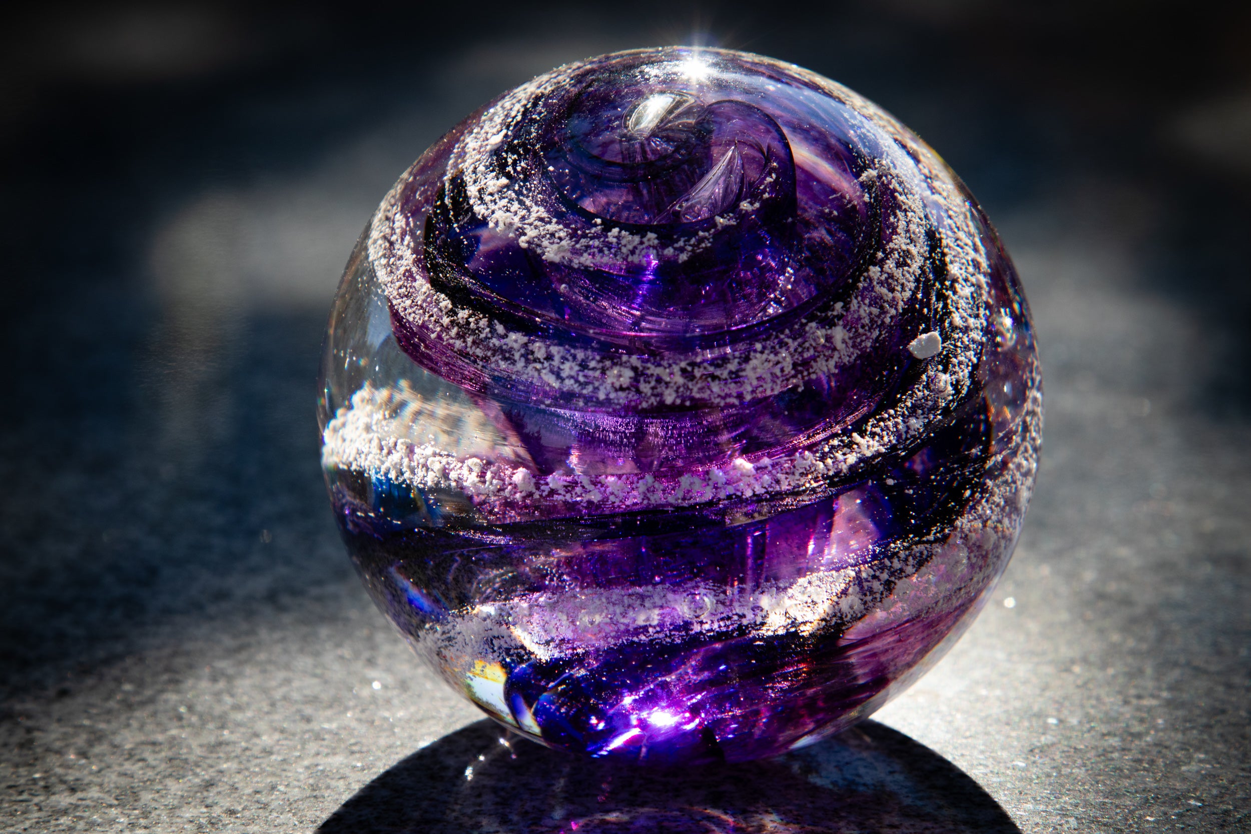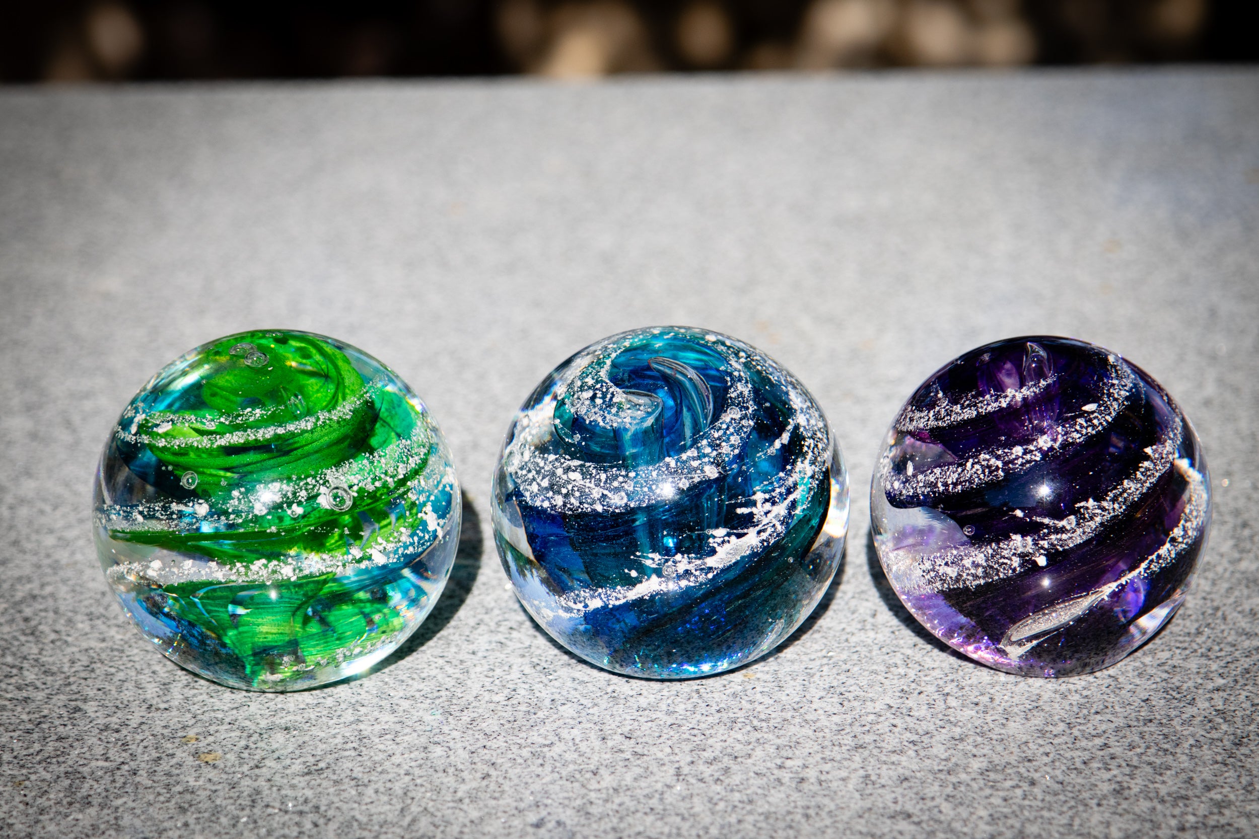 The orb portion of this bundle is created with love by Tyler. The cremains of your loved one are mixed into the 2000 degree molten glass, along with the color elements, and then allowed to cool for 48 hours. Once cooled, this lovely memorial will keep your loved ones ashes close and protected for generations to come.