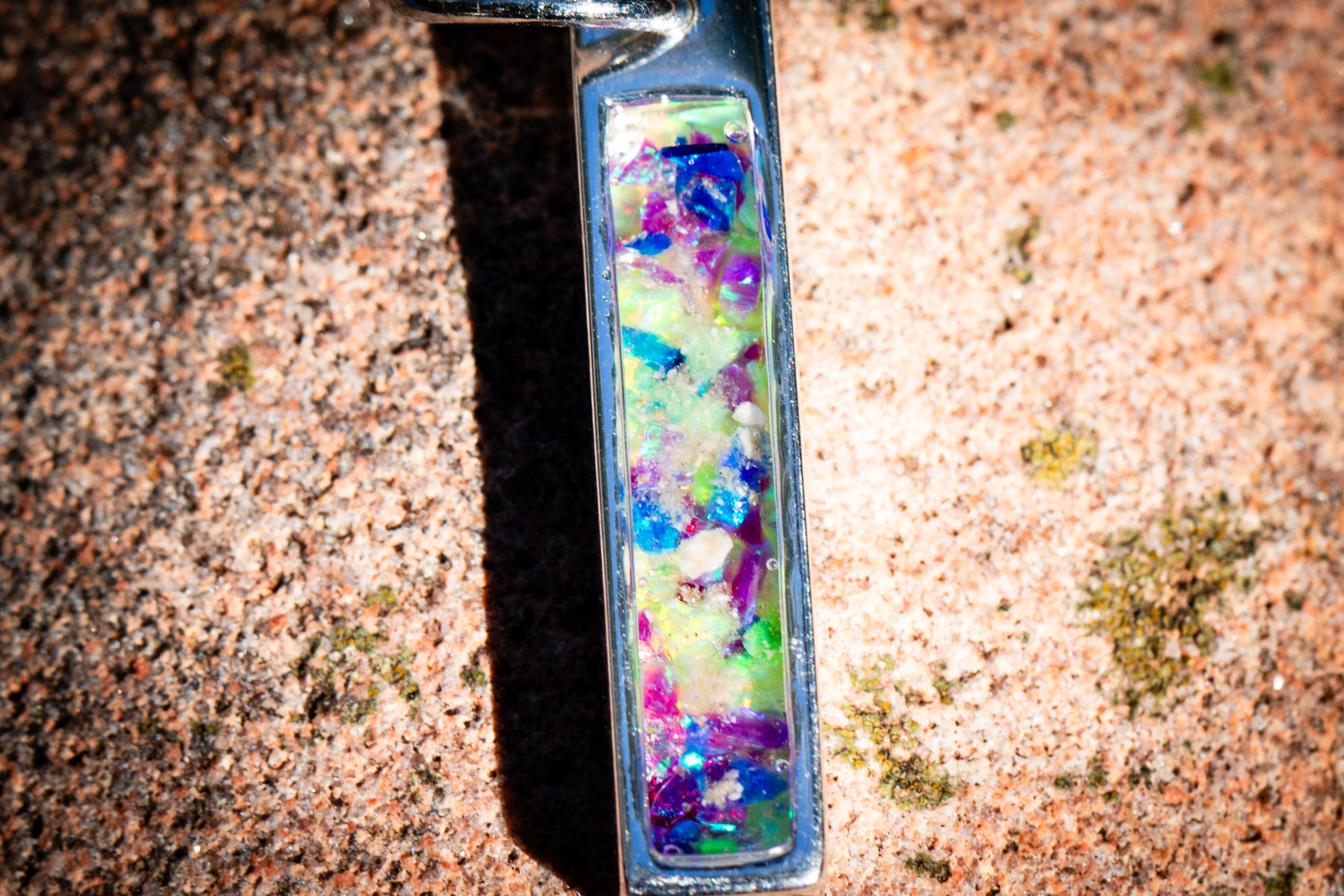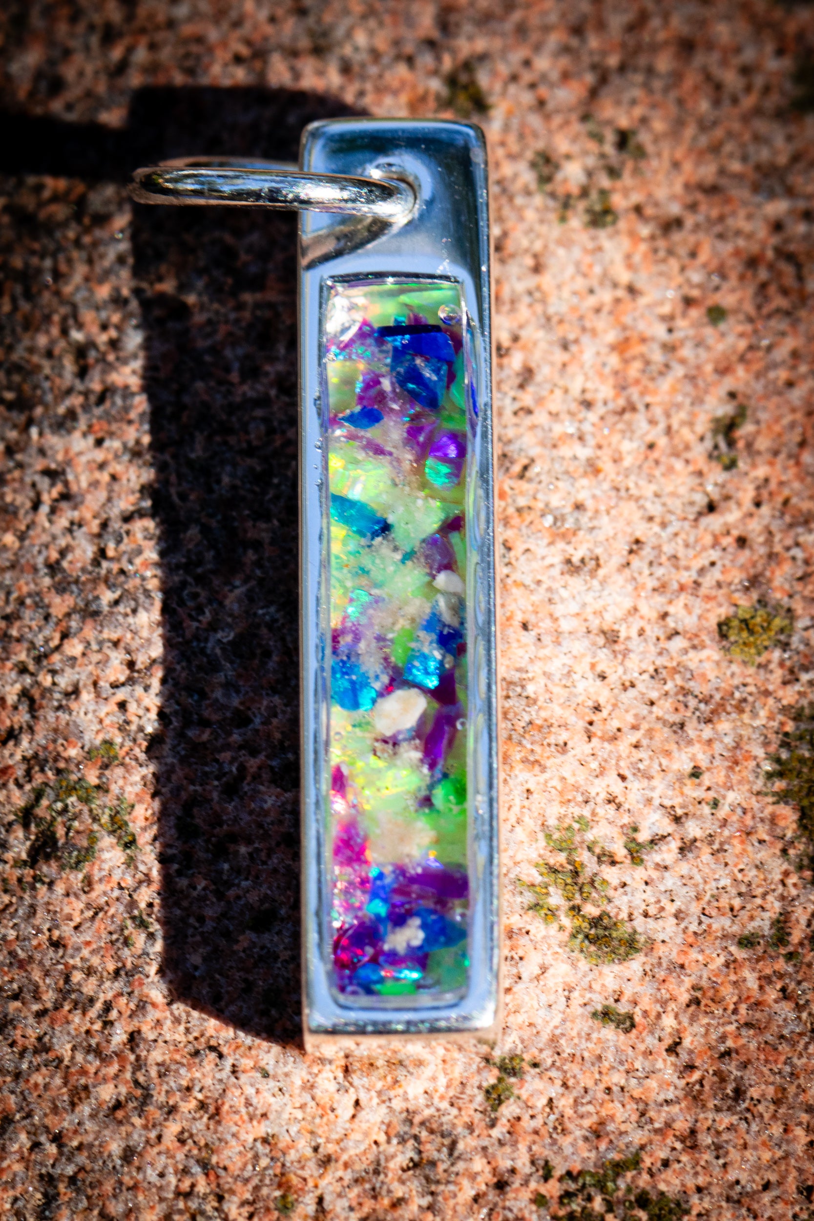This beautiful .925 sterling bar pendant has been filled with crushed synthetic opal and infused with cremation ash of your loved one, making it a lovely way to keep them close to your heart. Shown in Dark Blue & Turquoise, Peach & Light Yellow, Turquoise & White
