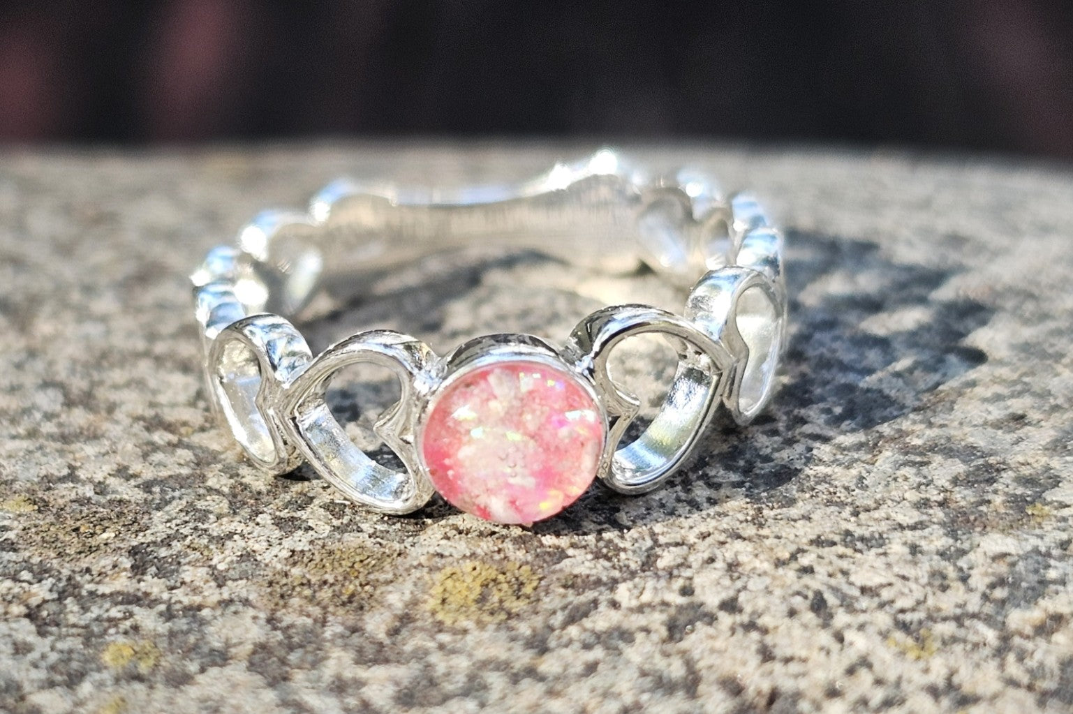 This leaf ring is more than just a beautiful piece of jewelry - it is a precious symbol of the eternal bond between you and your loved one. With its exquisite design and the inclusion of colorful crushed opal and cremation ashes, this ring is a celebration of life, love, and memory. Shown in Light Pink