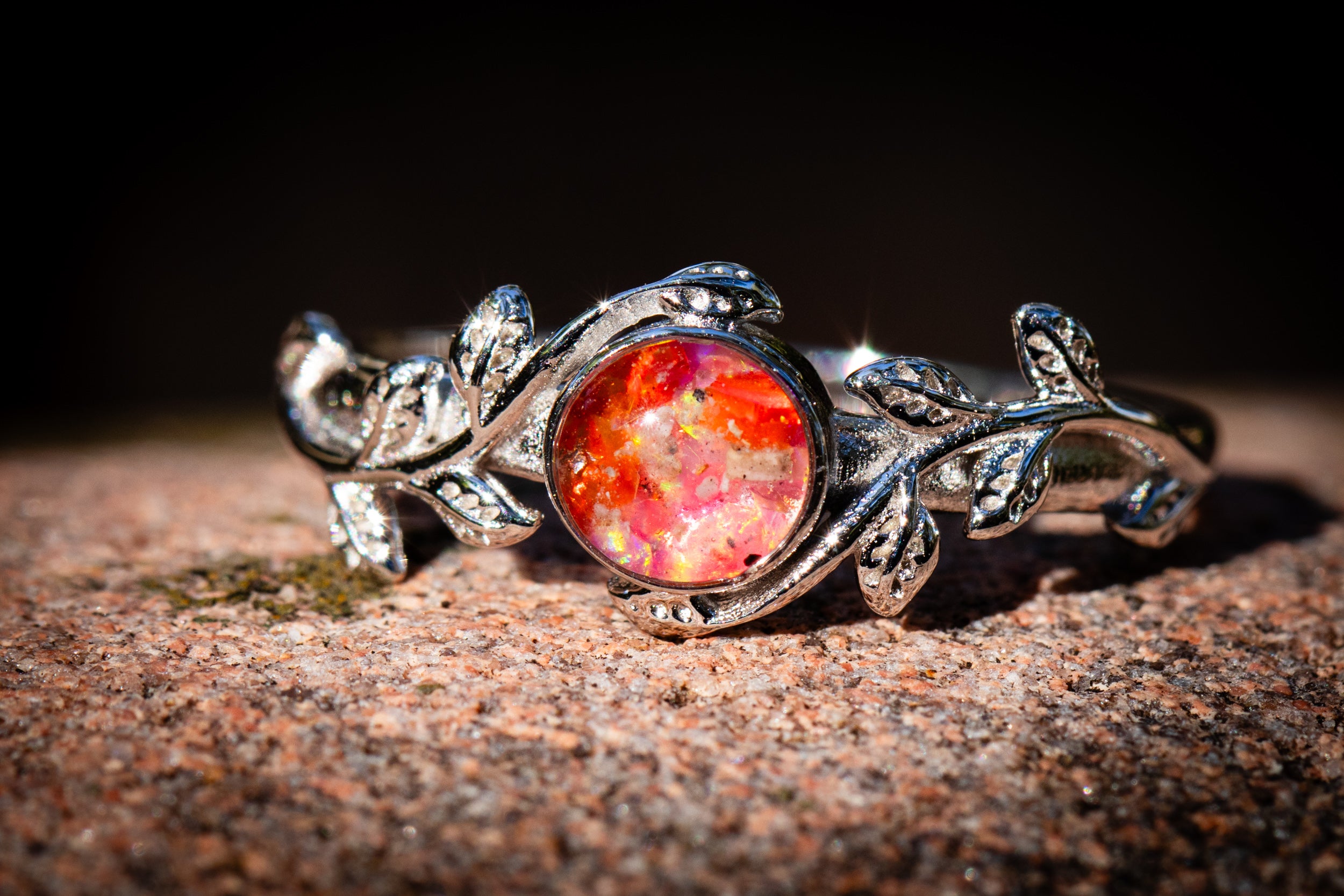 This leaf ring is more than just a beautiful piece of jewelry - it is a precious symbol of the eternal bond between you and your loved one. With its exquisite design and the inclusion of colorful crushed opal and cremation ashes, this ring is a celebration of life, love, and memory. Shown in Light Blue & White, Rainbow, and Turquoise & Magenta